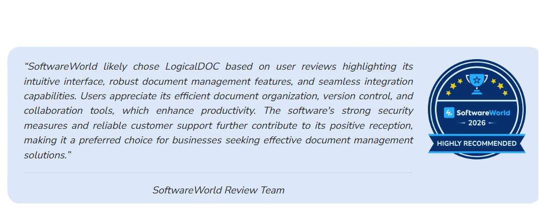 Siamo lieti di condividere un nuovo e importante riconoscimento per LogicalDOC: la piattaforma SoftwareWorld ha segnalato LogicalDOC come Highly Recommended, assegnando al prodotto un badge che ne certifica l’elevato valore all’interno del panorama delle soluzioni di Document Management.